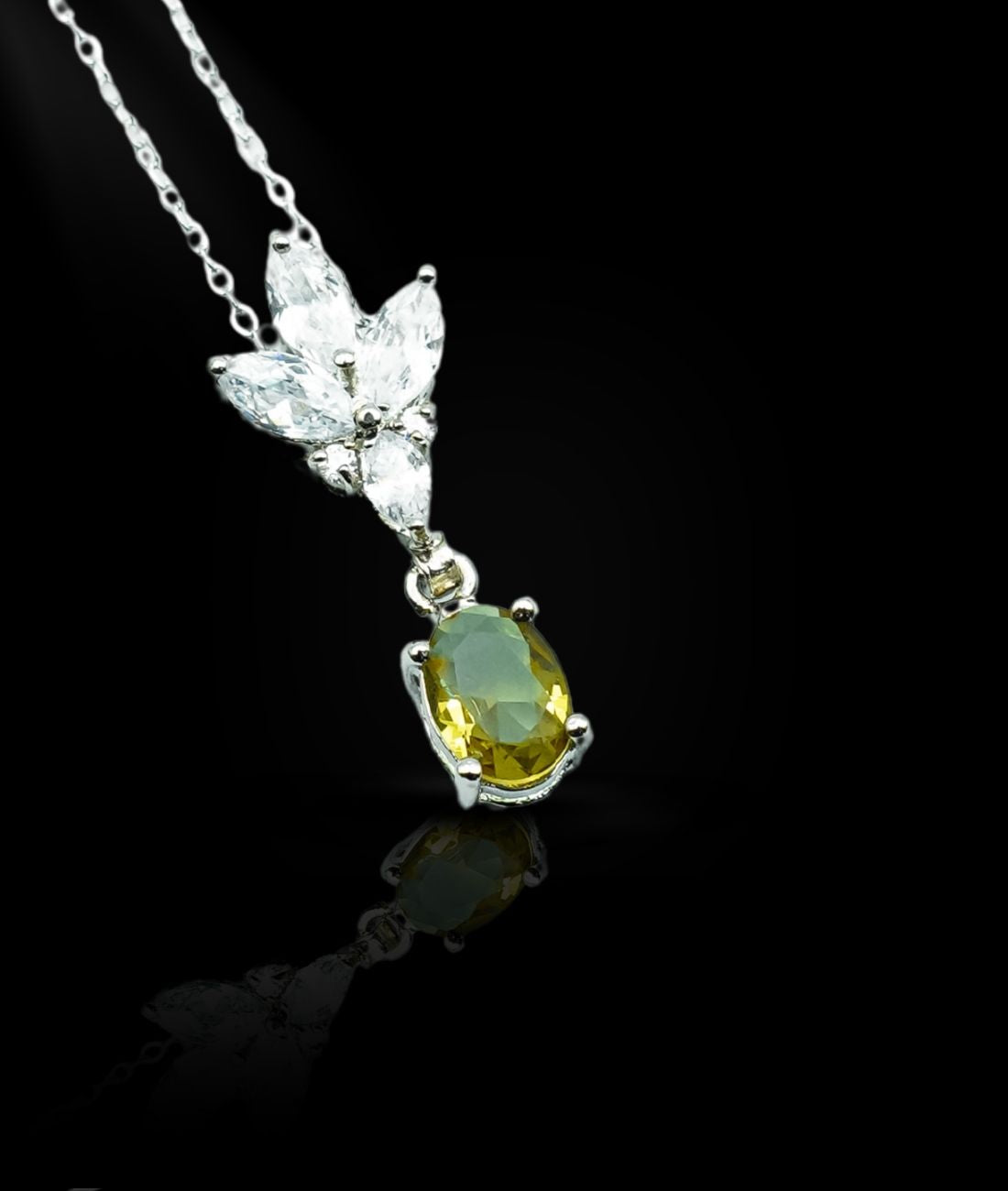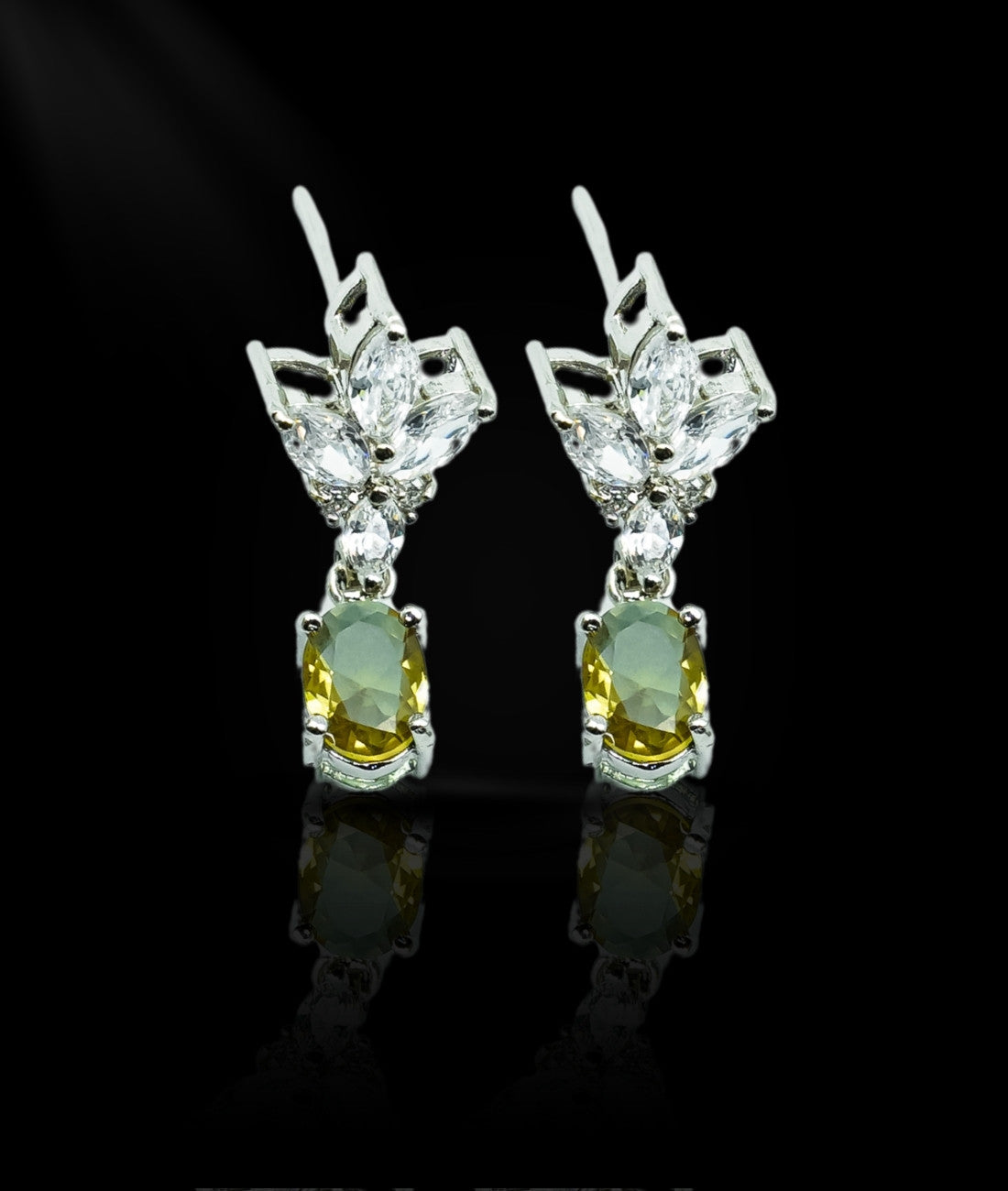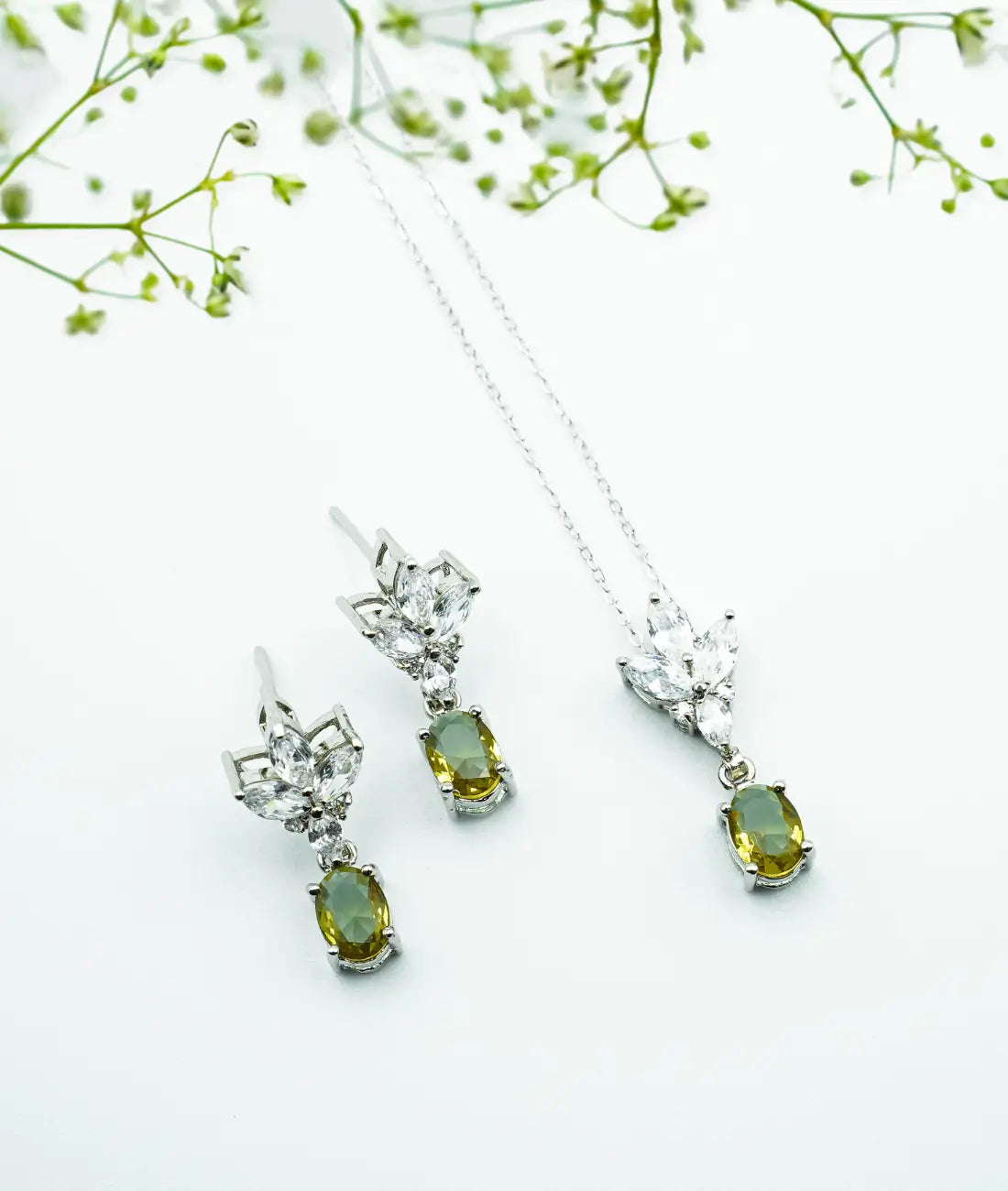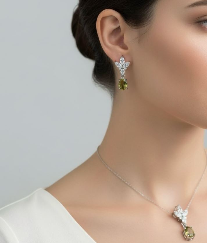 Oval 8 mm Zultani stones flip from honey-peach to emerald glow, suspended beneath a triple-line zirconia bloom. This rhodium-finished silver set blends regal grace with sleek elegance—made to turn heads from Nikkah vows to evening galas.