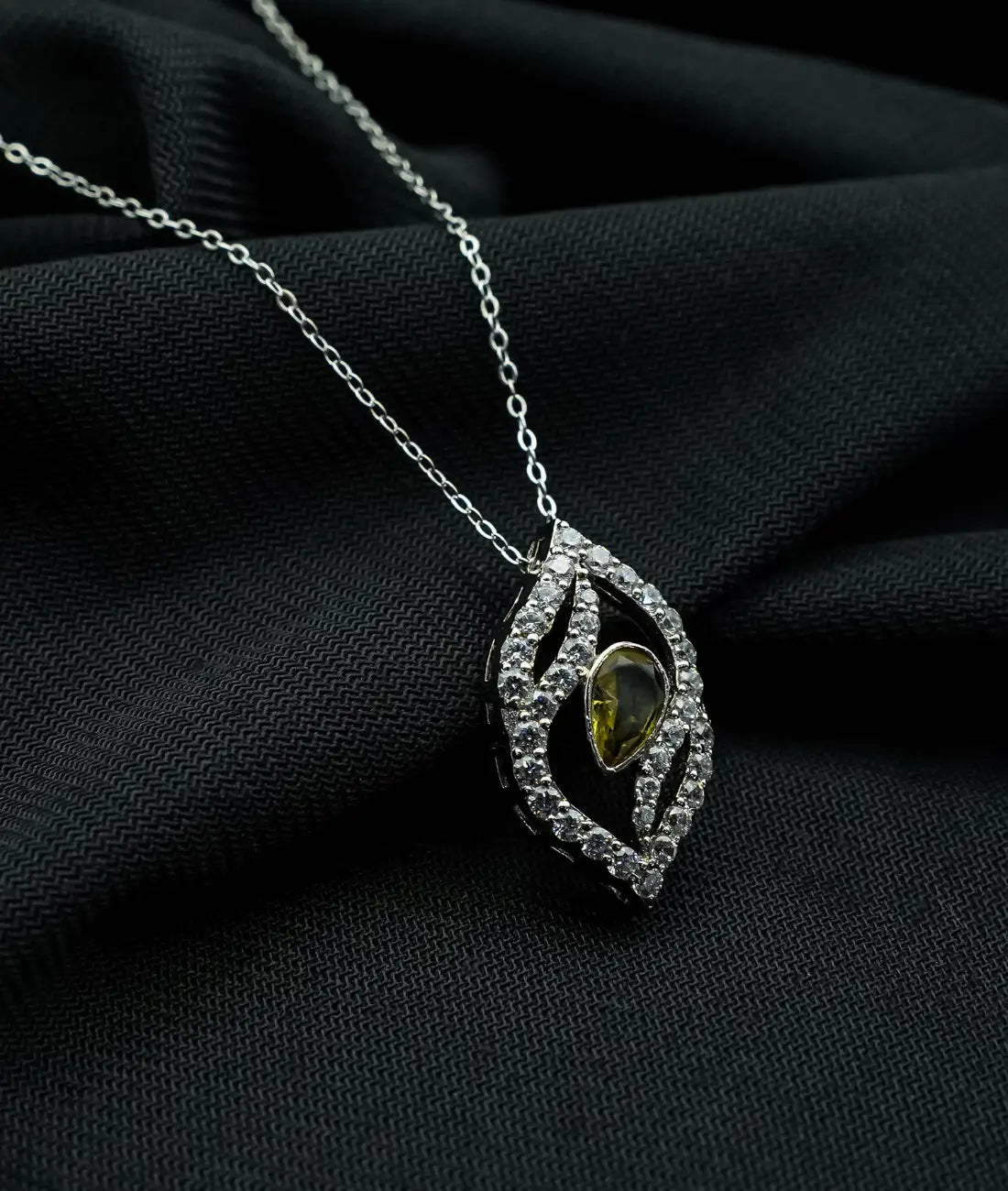 Sleek, sharp-oval pendant—rhodium curves drenched in white zirconia fire.