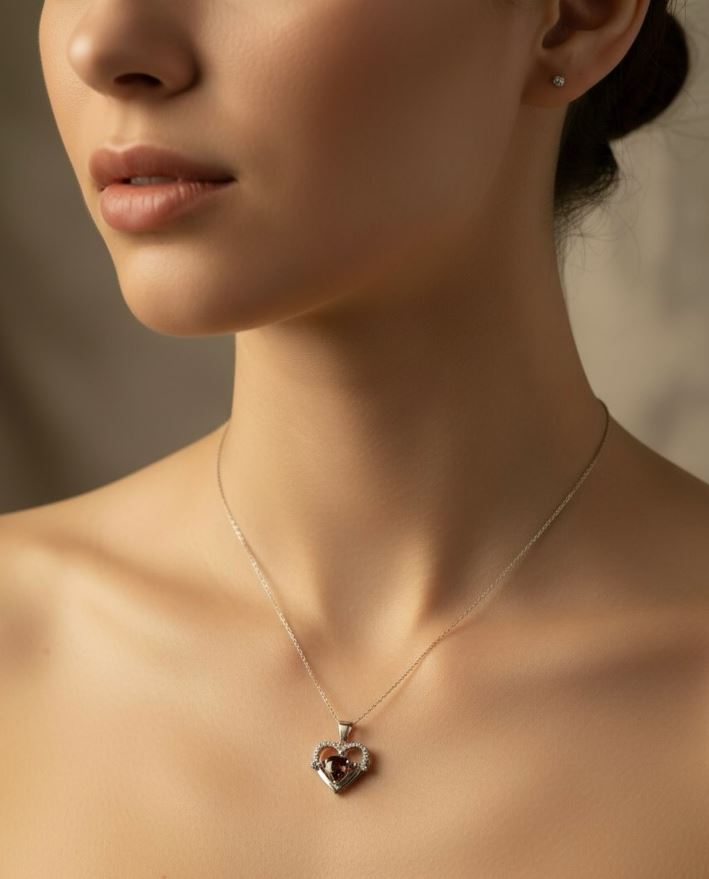 An 8 mm pear-cut Zultani flips peach dawn to emerald dusk, floating inside a heart. White zirconia sparkle across the upper curve; the lower arc gleams in sleek rhodium-bright silver. Quiet luxury that moves from morning meetings to moonlit walks.